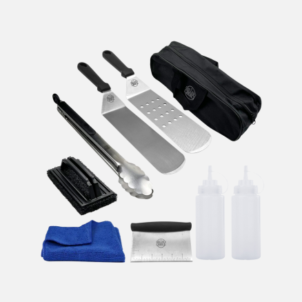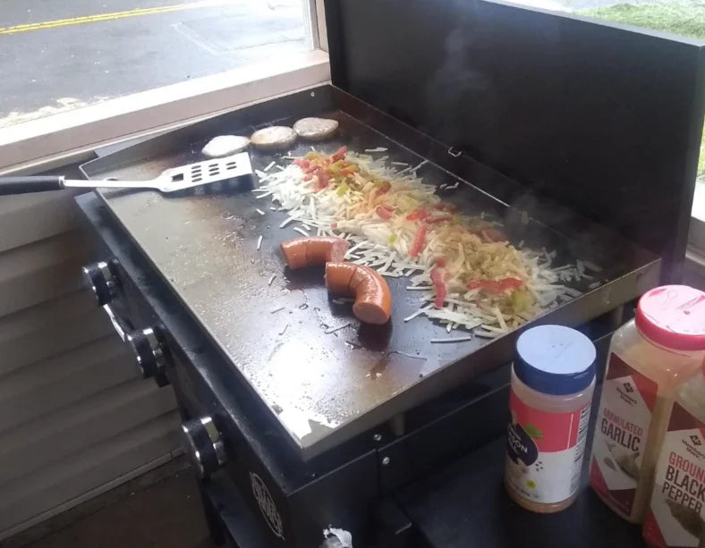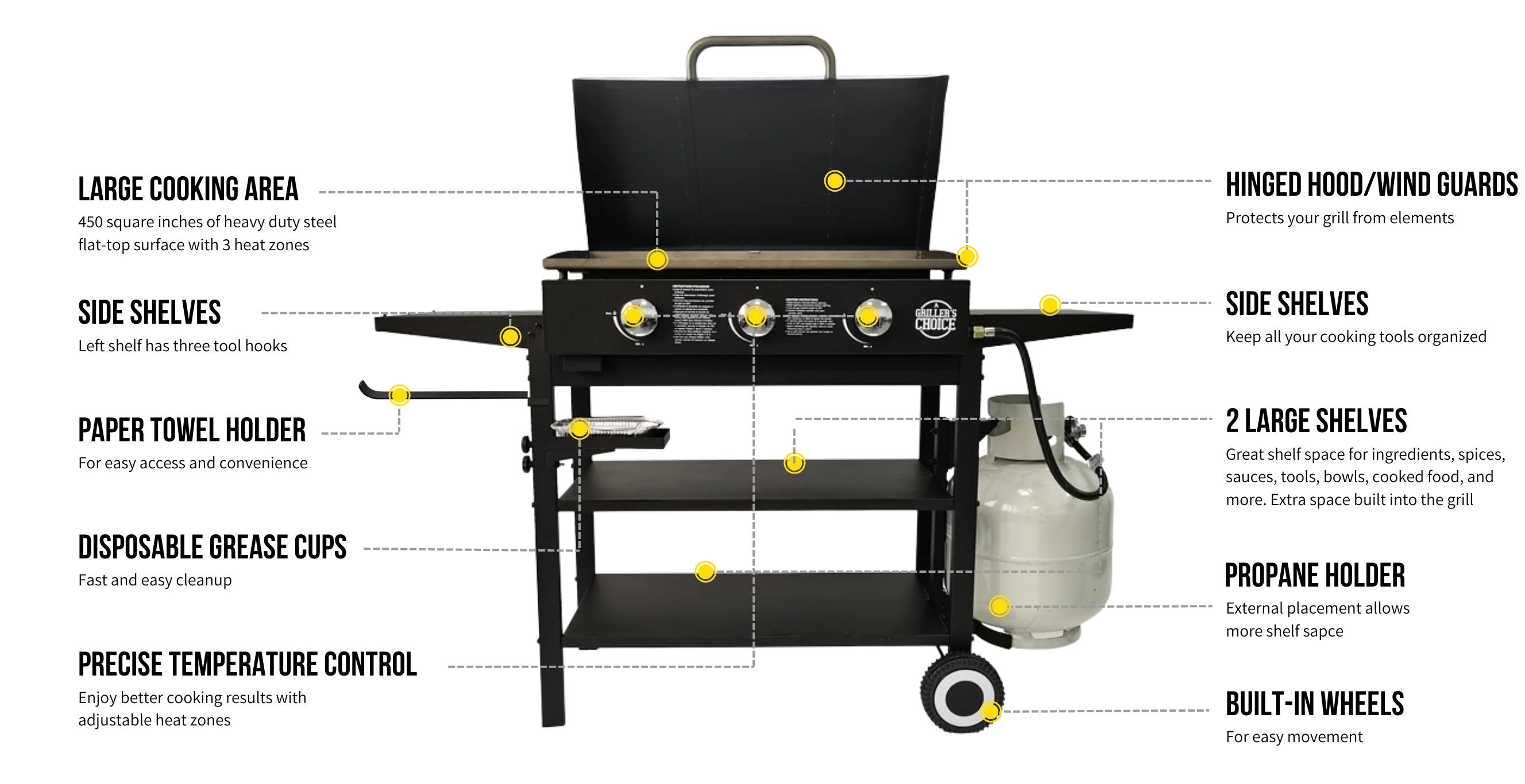 The cold-rolled steel flat top, built-in wind guards, front grease management system, and hinged hood provide unmatched versatility, while thoughtful extras like multiple storage shelves, tool hooks, paper towel holder, and disposable grease cups make cooking and cleanup effortless.